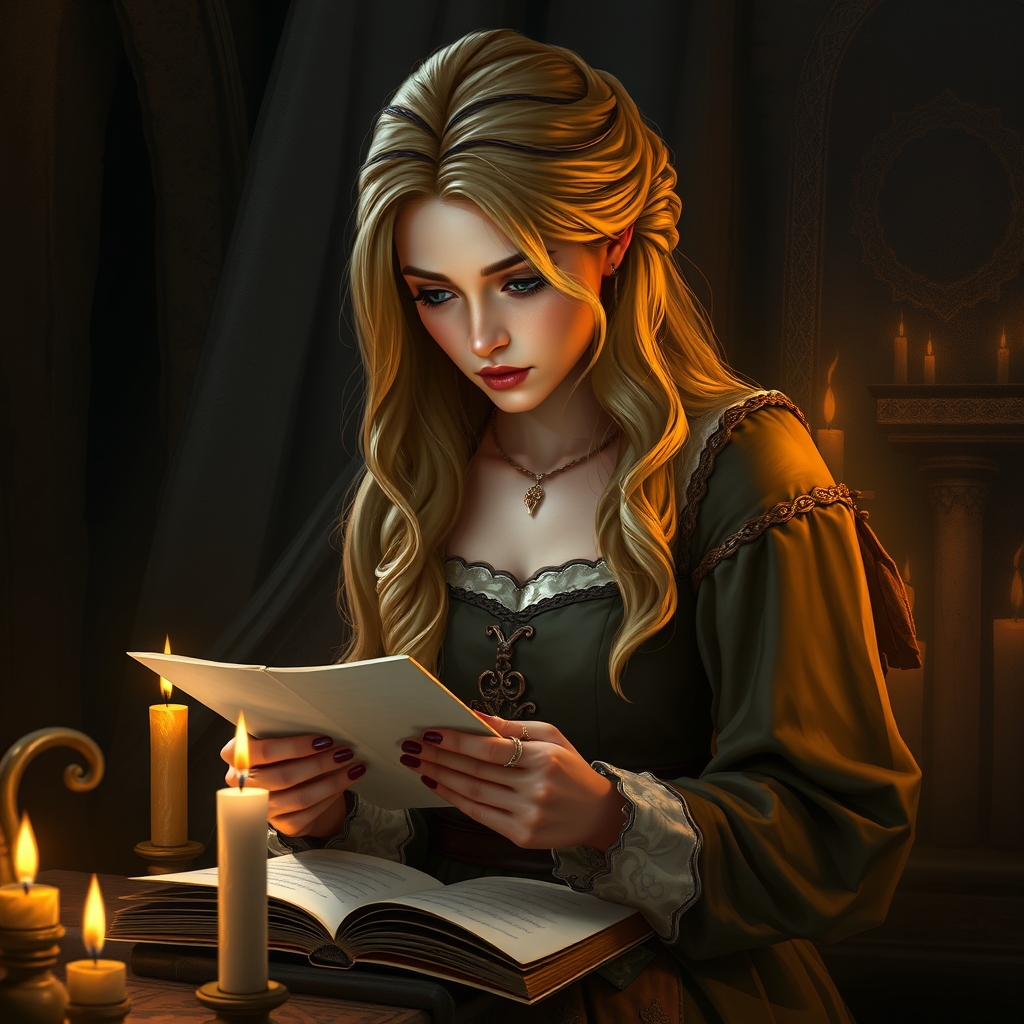 Blond woman in a medieval gown pensively writing a letter by candlelight, surrounded by a warm halo of flickering flames, captured in a fantasy art style reminiscent of renowned artists like Wojtek Fus and Magali Villeneuve. Echoing the visual elegance of 'The Witcher' and 'Ciri', this piece boasts a 4k resolution and draws inspiration from the best on Artstation. The artwork is an epic fantasy portrait, showcasing stunning character design with intricate details, seamlessly blending fantasy concept art with a captivating narrative essence.