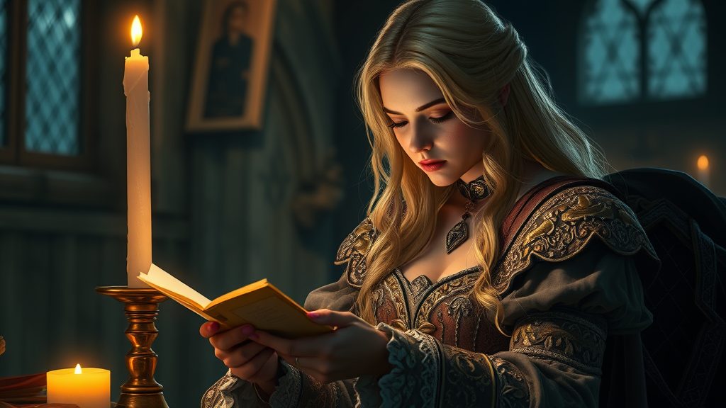 Blond woman in elaborate medieval gown writing a letter by candlelight, surrounded by a warm glow, fantasy concept art portrait reminiscent of Wojtek Fus, inspired by Ciri, crafted in a style echoing Magali Villeneuve's brilliance; 4k fantasy art capturing an epic essence, akin to the finest ArtStation fanart, reflecting the rich narrative of the Witcher universe, showcasing an epic fantasy portrait with detailed character artistry, embodying the fantasy game art genre with captivating and stunning character portrayal.