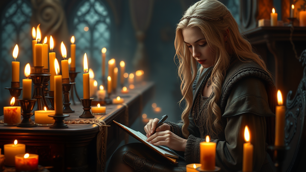 Blond woman in medieval attire engrossed in writing a letter, surrounded by an array of flickering candles, set in a rich, fantasy art realm. The scene exudes a mystic ambiance reminiscent of Wojtek Fus and graphic artist Magali Villeneuve, inspired by the world of Ciri from The Witcher. Rendered in stunning 4k, the artwork captures the essence of epic fantasy with intricate details and atmospheric lighting, embodying the best of fanart and Artstation inspirations. This portrayal offers a blend of fantasy game art and an evocative, captivating fantasy genre portrait.