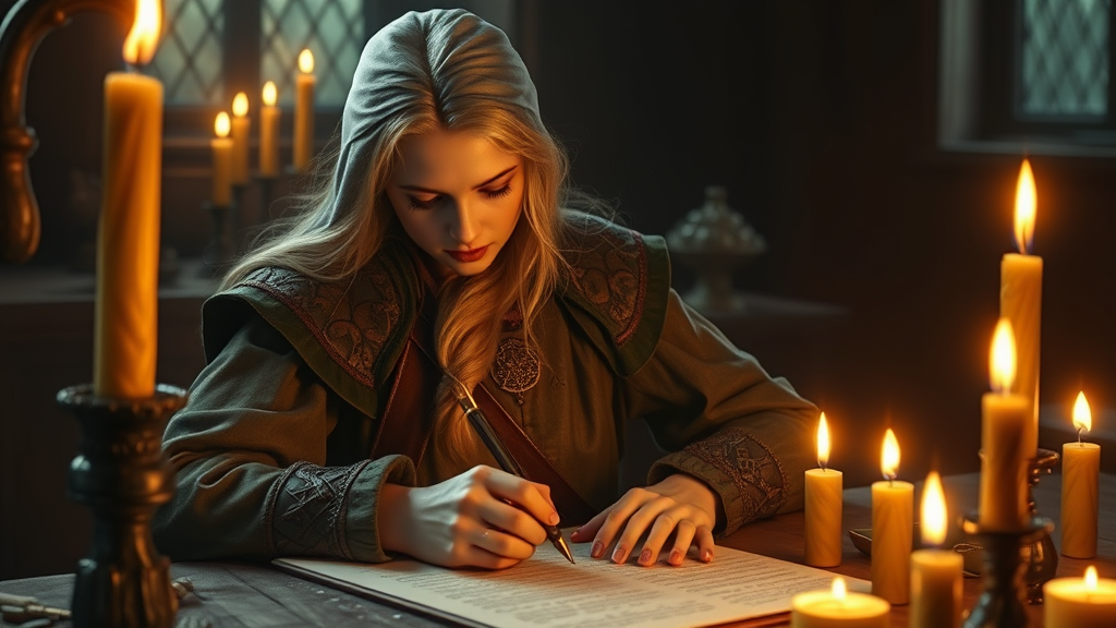 Blond woman in medieval attire penning a letter surrounded by flickering candles, fantasy art inspired by Wojtek Fus and graphic artist Magali Villeneuve, reminiscent of Ciri from The Witcher, rendered in an epic fantasy art style with 4k detail, capturing a stunning character art portrait in a fantasy genre setting, evoking the ambiance of concept art seen on Behance and best of ArtStation, infused with elements of fantasy game art and illustration.
