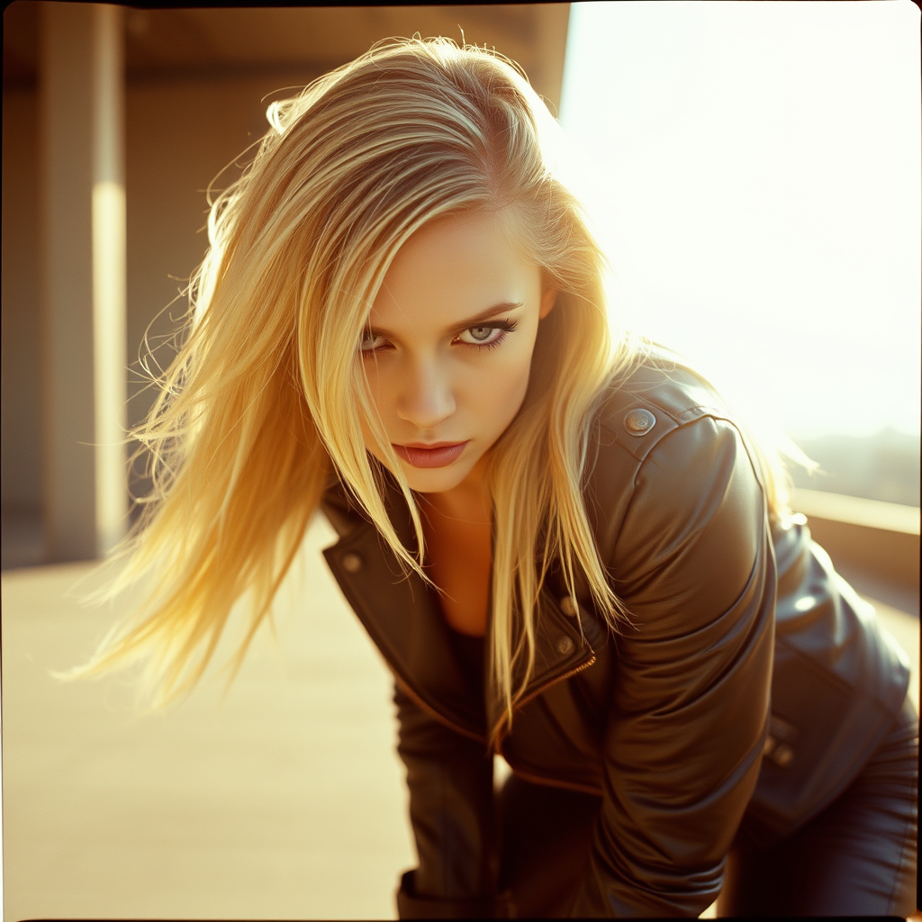 Blond woman wearing a leather jacket and leather pants, embodying the spirit of black metal and heavy metal with squinting eyes, leaning forward under cinematic lighting, the warm sun highlighting her features in a captivating way, the scene evoking the aesthetic of a Kodak Portra 800 polaroid photo, aspect ratio 9:16, capturing an attractive and dynamic presence.