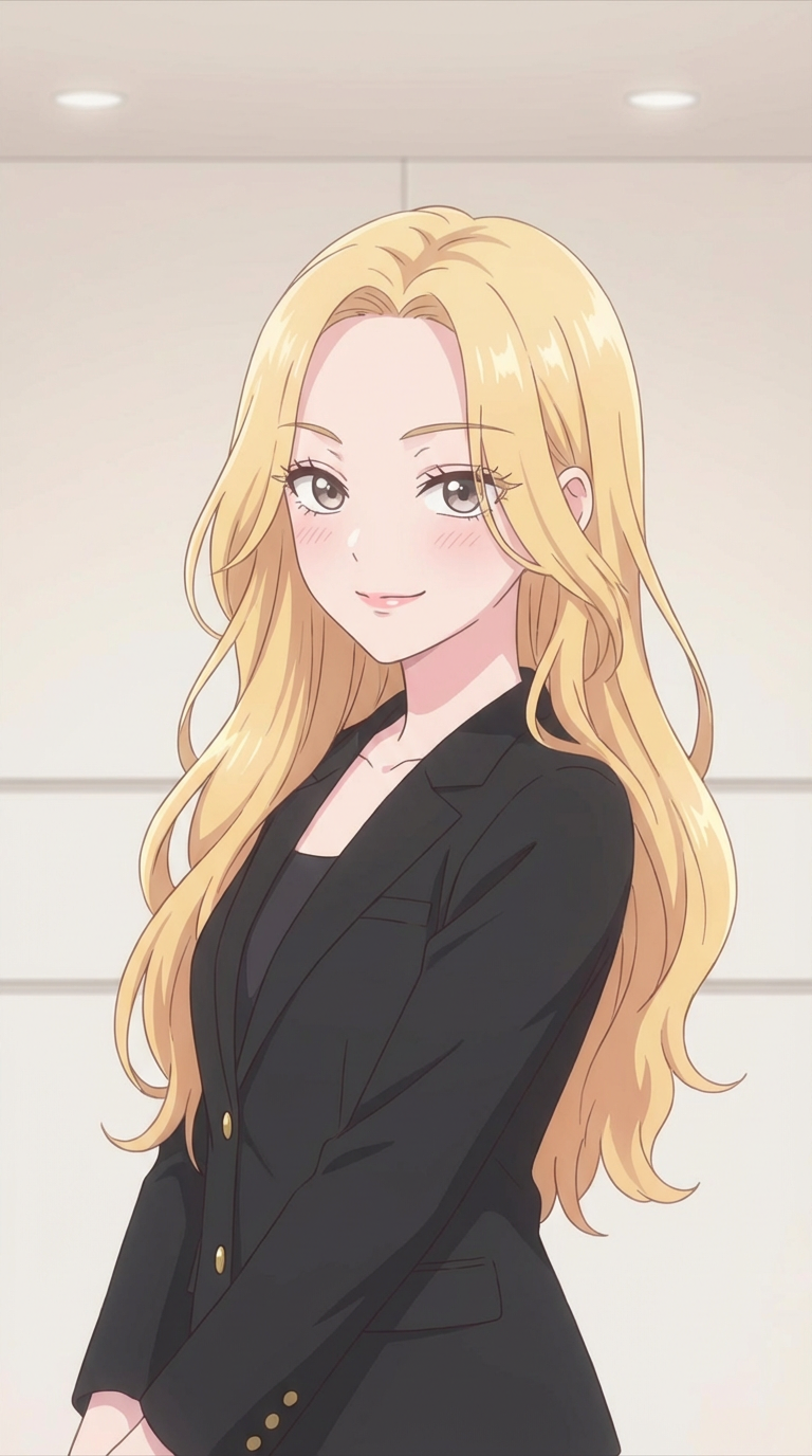Anime style portrait of a beautiful blonde woman with long, flowing hair, looking directly at the viewer with a slight smirking expression. She is wearing a fitted black blazer and skirt, with subtle gold buttons on the blazer. The composition is a medium shot, from the waist up, with her body angled slightly to the left. The lighting is soft and even, highlighting her features and hair. The background is a simple, light beige wall with faint horizontal lines, creating a clean and minimalist atmosphere. Colors are predominantly black, beige, and the golden hues of her hair. Subtle blush and detailed eyelashes enhance her elegant look.