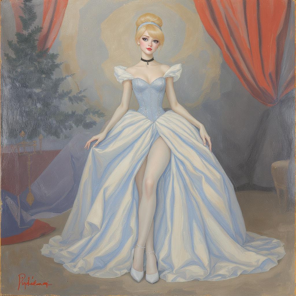 Blonde-haired Cinderella portrayed in the style of Pino Daeni as a full-body oil painting illustration. The artwork features an ethereal quality with unusual color blends and a slightly dreamy blurriness. Cinderella's figure is rendered with graceful yet surreal elements, including subtly exaggerated features and an abstract touch. The pose captures a whimsical essence, with hands and limbs showing playful, artistic interpretations, while maintaining the core fairy tale theme. The painting invokes a sense of classic elegance combined with an avant-garde artistic twist.