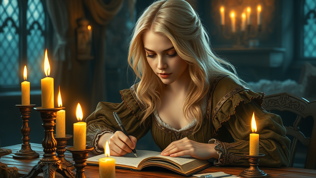 Blonde woman in a medieval gown penning a letter by the glow of multiple flickering candles, captured in a stunning fantasy art style reminiscent of Wojtek Fus and Magali Villeneuve. Vibrant and detailed, the scene evokes the enchantment of a fantasy world akin to "The Witcher." The woman's expression is focused and serene, her surroundings rich in texture and depth, creating an immersive epic fantasy portrait. This 4k artwork is reminiscent of top fanart on ArtStation, combining elements of epic fantasy game art with a captivating character study.