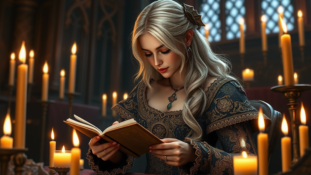 Blonde woman in an intricate medieval gown, immersed in writing a letter by the soft glow of numerous candles, fantasy concept art portrait, inspired by fantasy styles from artists like Wojtek Fus and Magali Villeneuve, with an aesthetic reminiscent of Ciri from the Witcher series, showcasing epic fantasy game art in 4k, a stunning character study in a vibrant fantasy world, embodying the magic and allure of the fantasy genre with rich textures and dynamic lighting, suitable for showcasing on platforms like Behance and ArtStation.