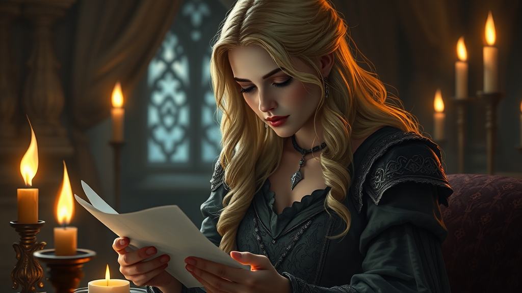 Blonde woman in medieval attire composing a letter by candlelight, surrounded by flickering candles, fantasy art inspired by Behance, concept art portrait with a touch of Wojtek Fus and Ciri's essence, graphic influence of Magali Villeneuve, captured in 4k fantasy art style, reminiscent of fanart found on top ArtStation galleries, embodies epic fantasy art style and game art intricacies, a stunning character portrait in the fantasy genre.