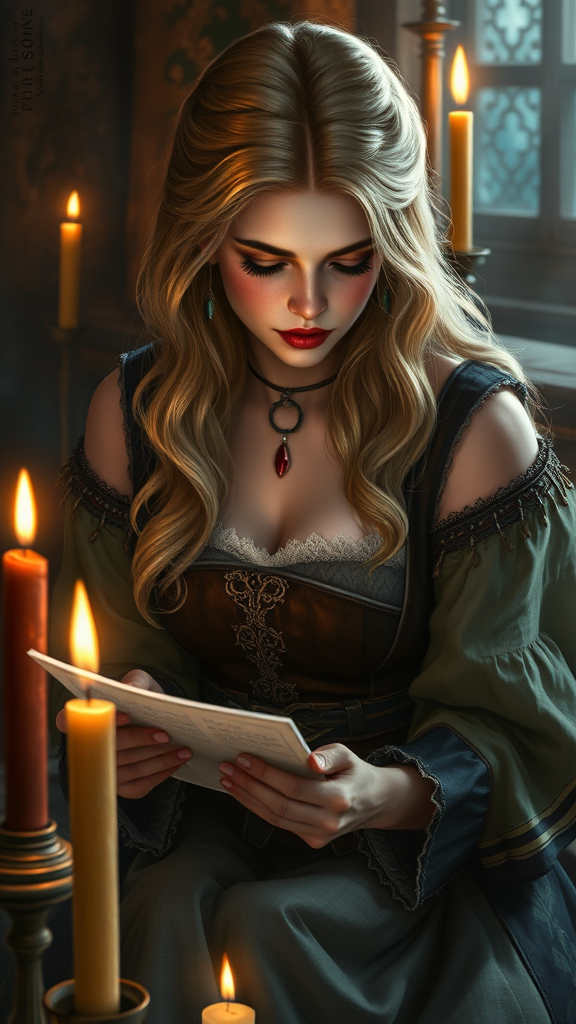 Blonde woman in medieval gown composing a letter by candlelight, surrounded by flickering flames, fantasy concept art portrait, inspired by Wojtek Fus and Ciri, crafted by graphic artist Magali Villeneuve, 4k fantasy illustration, masterpiece on ArtStation, Witcher-inspired, epic fantasy portrait, immersive fantasy game art, breathtaking character depiction in fantastical setting.