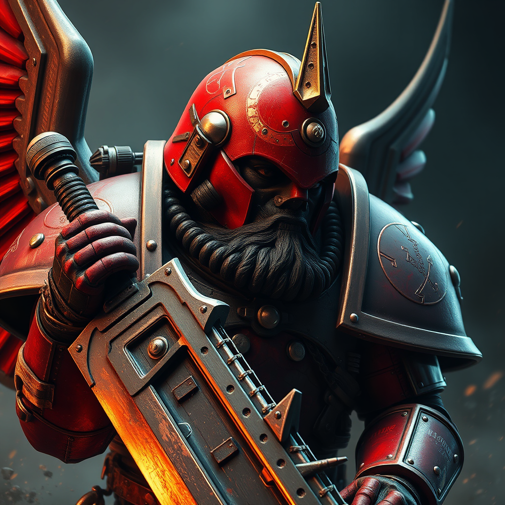 Blood Angels captain wielding a chainsaw sword, featuring a centurion helmet and robust armor, captured in an extremely detailed digital painting. Embracing a Warhammer 40k theme, inspired by Raymond Swanland and Tomasz Alen Kopera, the scene comes alive in Unreal Engine 5. Exquisite, intricate lighting emphasizes the highly detailed and cinematic aesthetic, rendered in Octane for remarkable coherence. This 8k artwork, trending on ArtStation, offers a striking side profile, highlighting bold features and dramatic expressions without distorting anatomical proportions. Emphasizing artistic mastery, the piece avoids cartoonish elements, poorly drawn features, watermarks, or unnecessary text, resulting in a visually stunning homage to the iconic universe.