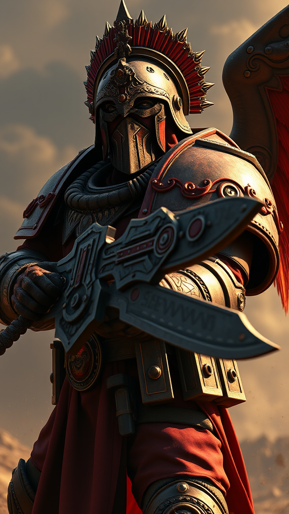 Blood Angels captain wielding a chainsaw sword, wearing an ornate centurion helmet and imposing, bulky armor; inspired by the intricate styles of Raymond Swanland and Tomasz Alen Kopera, set in the Warhammer 40k universe. Rendered with Unreal Engine 5 for exquisite, cinematic lighting and a highly detailed digital painting in 8k resolution, capturing the essence of dramatic, trending art on ArtStation. Features cinematic side profile with emphasis on the texture of armor, and detailed facial characteristics. The artwork avoids poor anatomy, cartoonish elements, and unnecessary text or watermarks, ensuring a coherent and aesthetically striking presentation.