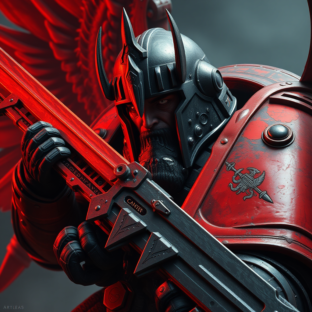 Blood Angels captain wielding a massive chainsaw sword, adorned with a centurion-style helmet and robust, intricate armor. Captured in highly detailed digital painting influenced by Warhammer 40k aesthetics. The art resonates with the style of Raymond Swanland and Tomasz Alen Kopera, utilizing Unreal Engine 5 for exquisite, cinematic lighting and coherence. Rendered with octane, the scene showcases outstanding detail and artistic depth, highlighting the character's profile with meticulous attention to the mouth and ears, set in an epic 8k resolution. The work is trending on ArtStation, embodying a powerful, cinematic presence without imperfections or distortions.