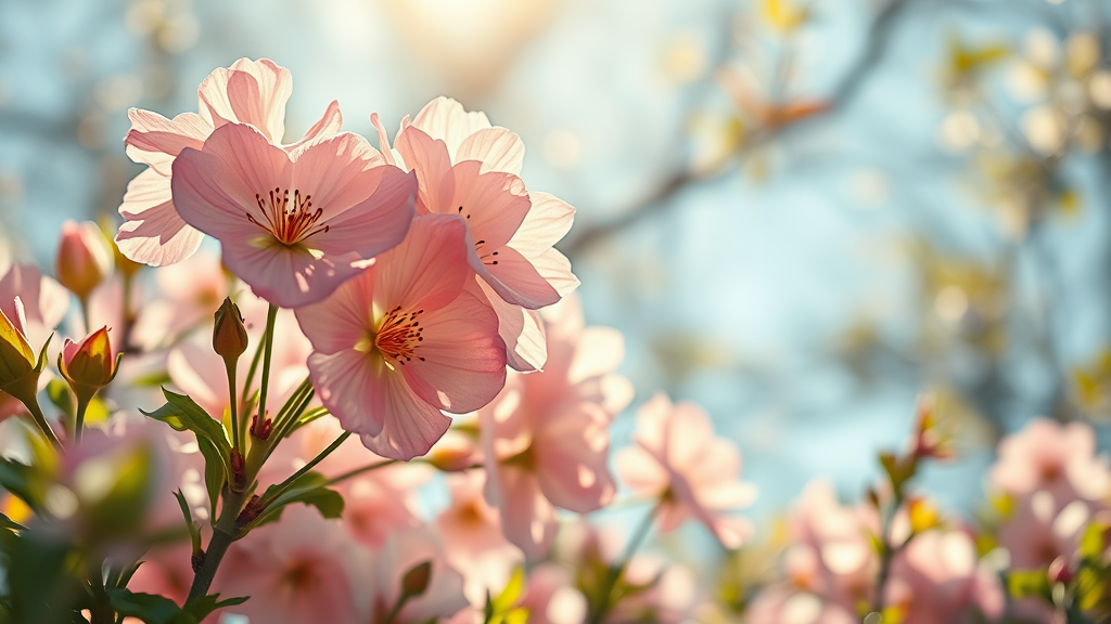 Blossoming flowers flourish under a gentle breeze, symbolizing new beginnings as spring breathes life into the world. The scene is set with dappled light casting intricate and highly detailed patterns, revealing breathtaking beauty with precise lineart. The vibrant palette evokes a comprehensive cinematic quality, reminiscent of Anna Dittmann's artistry, achieving an 8k level of stunning clarity. The essence of spring unfolds with fresh colors and delicate designs, enveloping the viewer in a serene yet energizing ambiance. Embrace the wonder of rebirth and renewal through this vibrant depiction of nature’s awakening.