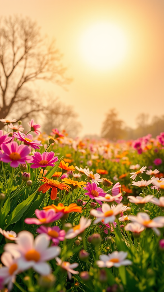 Blossoming joy in spring's embrace, vibrant flowers dance under the golden sun, as gentle breezes carry the sweet scent of renewal, casting a serene glow over the lush landscape.