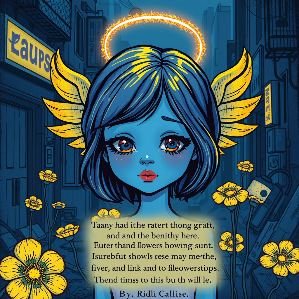 blue girl with iridescent gold angel halo headpiece, surrounded by neon-lit, disparity-rich urban decay in dark blues and yellows, simplistic cartoon aesthetic with subtle symbolism, brooding solapunk-inspired illustrations of rotting flowers and retro-futuristic machinery, overlaid with haunting lyrics in a distressed, art nouveau-inspired font, gleaming starlight on her delicate features.