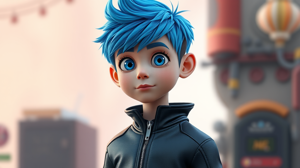 Blue-haired boy with a futuristic black zipper top, rendered in a whimsical and vibrant Pixar-Disney style with 3D elements. The scene features a highly detailed and colorful canvas frame, capturing the essence of a video game environment. The character is creatively styled with fantastical features and exaggerated proportions, set against a softly blurred background, adding an element of dreamlike surrealism. The visual composition includes dynamic, playful use of color and light, maintaining a balance between realism and cartoonish charm. The boy's expressive features are highlighted, with attention to unique detail, creating a sense of adventure and intrigue. The overall atmosphere is lively, imaginative, and enchanting, inviting viewers into a world of wonder.