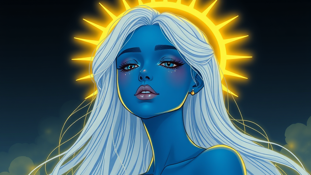 Blue-skinned girl with a golden halo, styled in neon realism, exuding dark romance, featuring a palette of deep whites and yellows, solarpunk vibes, breathtakingly beautiful, minimalist cartoon essence, with a brooding and contemplative atmosphere.