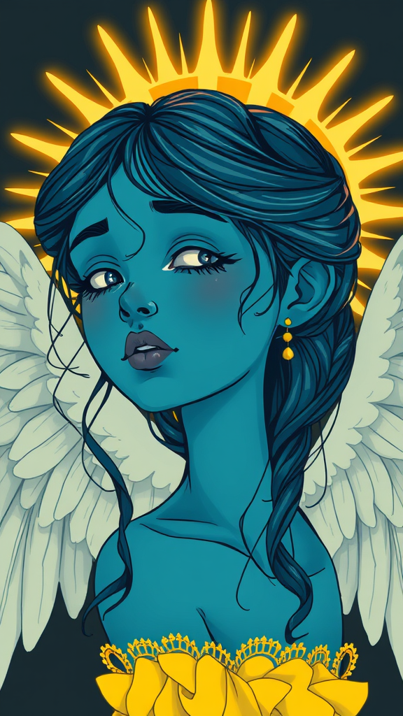 blue-skinned girl with a radiant gold angel halo, depicted in neon realism style, blending darkly romantic elements with solar punk aesthetics; striking palette of muted white and yellow hues, intricately simple cartoon design, exuding a brooding yet mesmerizing atmosphere, leaving one in awe of its beauty