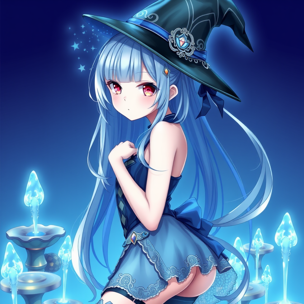 Blue theme, enchanting, magical girl, microskirt, gradient background, shimmering silver-blue hair, blunt bangs, graceful sidelocks, captivating pink eyes, elegant allure, thigh gap, delicate hair ornament, arched posture, black witch hat with intricate embellishments, mystical fountains, luminescent crystals.