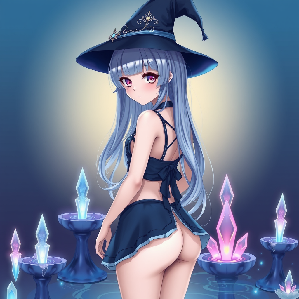 Blue theme, enchanting masterpiece, magical girl with a microskirt, standing against a gradient background. Her silver-blue hair cascades with blunt bangs and delicate sidelocks framing her face, highlighting her captivating pink eyes. She has a medium build with a noticeable thigh gap, and her hair is adorned with an elegant ornament. Her back arches gracefully as she wears a black witch hat adorned with intricate embellishments. Surrounding her are mystical fountains and glowing crystals, enhancing the otherworldly atmosphere.
