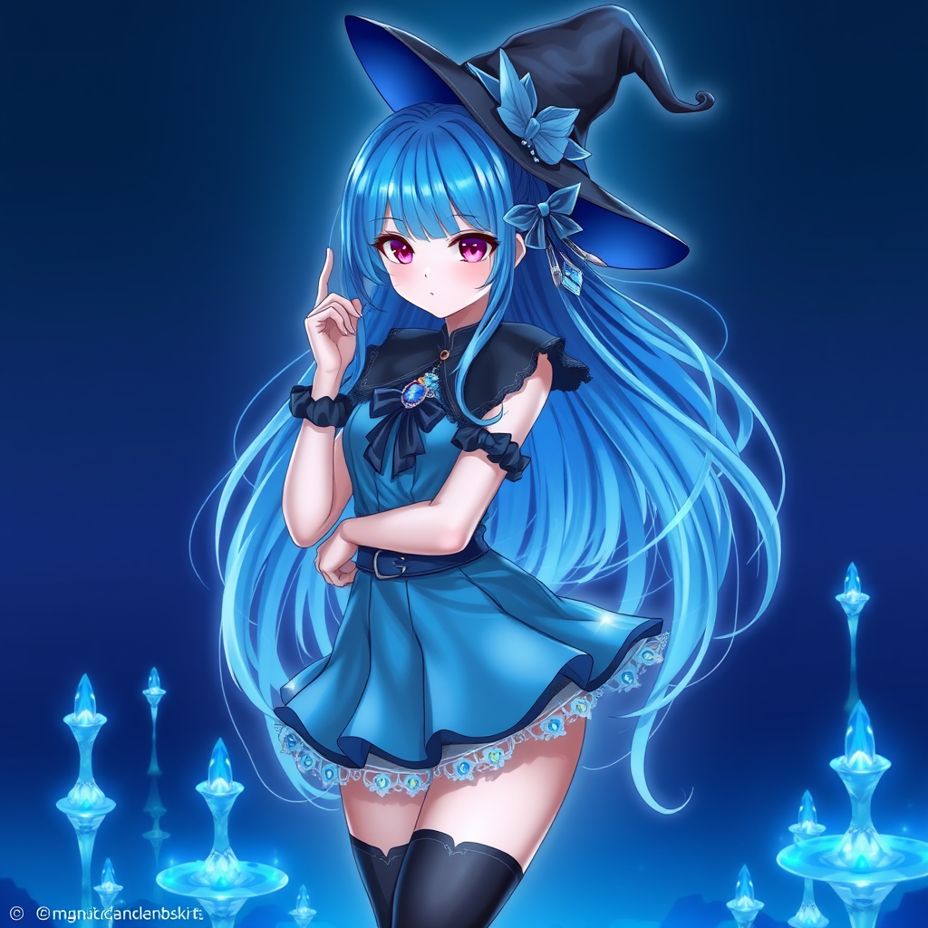 Blue theme, masterpiece, enchanting heroine, microskirt, ombre background, shimmering azure hair, straight bangs, elegant sidelocks, rose-colored eyes, moderate bust, slender thighs, decorative hair accessory, graceful posture, dark witch hat, elaborate details, magical fountains, luminous gemstones.