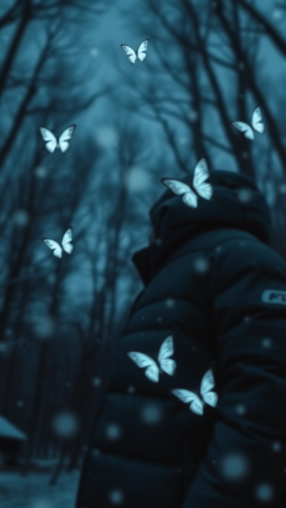 Blurry image of a snowy winter puffer jacket fashion at night, with a surreal sky swirling with change and wind in hues of deep red and electric blue. Realistic butterflies softly glow as they flutter in a shadowy forest, embodying minimalist beauty. The scene captures an androgynous allure with a light black and cold color palette, infused with cosmopolitan energy. Serene faces appear amid the loose and fluid forms, enveloped in ethereal abstractions, adding an element of chaos within order.