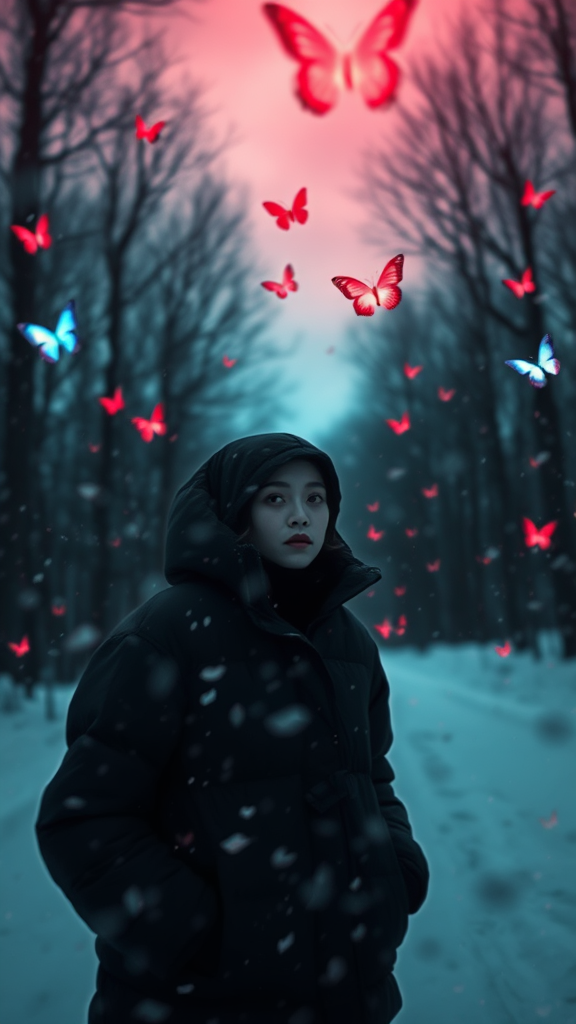 Blurry image of a snowy winter puffer jacket fashion scene at night, under a surreal sky filled with dynamic winds and hues of deep red and azure, surrounded by realistic, softly glowing butterflies in a mysterious dark forest. The style embodies minimalist beauty with a focus on androgynous figures in a subdued black and cool-toned palette, exuding a cosmopolitan vibe. Serene faces appear with fluid, unrestricted movements, showcasing ethereal abstractions amidst a sense of calm chaos, captured in an aspect ratio of 2:3.