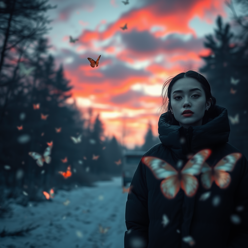 Blurry image of a snowy winter puffer jacket fashion scene at night, under a surreal sky filled with shifting clouds and winds, tinted in shades of crimson and azure. Realistic butterflies gently glowing in a shadowy forest setting, embodying minimalist beauty. Androgynous figures with serene expressions in lightly muted black tones, set against a cool color palette that exudes cosmopolitan vibes. The attire is loose and fluid, surrounded by ethereal abstractions, capturing a sense of peaceful chaos and energy.