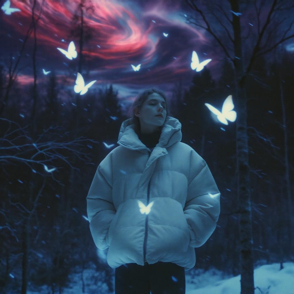 Blurry image of a snowy winter puffer jacket fashion, set under a surreal night sky swirling with winds of change in hues of red and blue. Realistic butterflies emit a soft glow, fluttering through a dark forest. The style embodies minimalist beauty, with androgynous figures draped in light black attire. A cold palette enhances the cosmopolitan energy, with serene expressions on fluid faces amidst ethereal abstractions. The scene conveys an atmospheric chaos, balanced with elegance and tranquility, interpreted in a 2:3 aspect ratio, and infused with a high level of stylistic creativity.