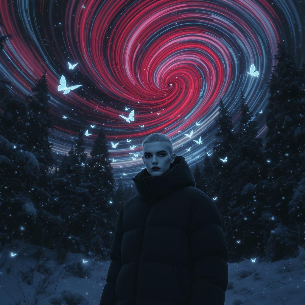Blurry image of a snowy winter puffer jacket fashion scene at night, featuring a surreal sky with dynamic winds swirling in shades of deep red and cool blue. Realistic butterflies emit a gentle, ethereal glow amidst a shadowy forest, embodying minimalist beauty. The scene captures an androgynous elegance, with a light black, cold color palette exuding cosmopolitan energy. Serene faces contrast with the loose, fluid forms and the ethereal abstractions of the landscape, evoking a sense of dreamlike chaos and harmony.