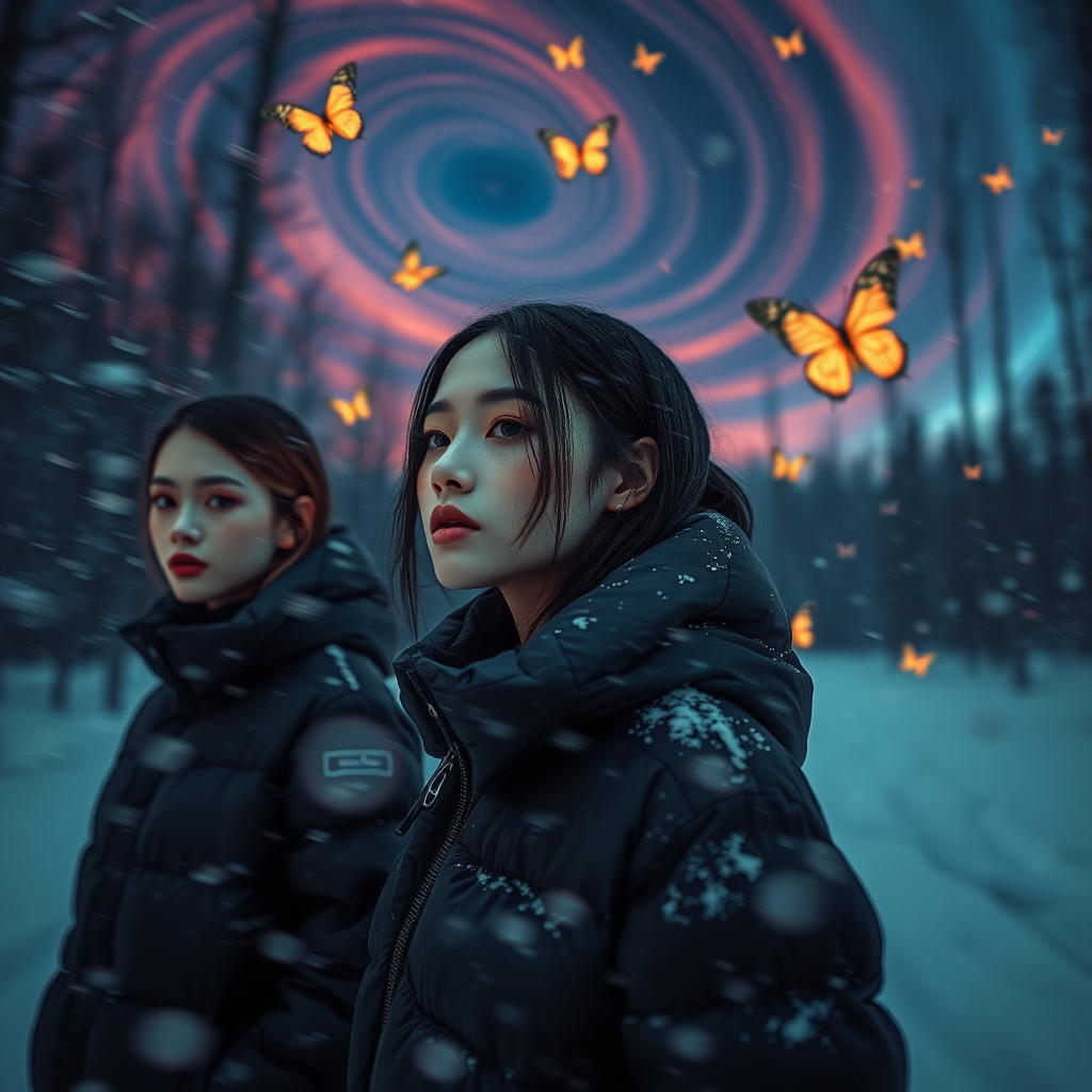 Blurry image of snowy winter fashion featuring sleek puffer jackets, under a surreal night sky awash with swirling hues of red and blue, dotted with realistic butterflies casting a gentle glow within a shadowy forest. A minimalist beauty emerges, embodying an androgynous allure within a cool palette of deep blacks and midnight tones. The scene exudes a cosmopolitan energy, with tranquil faces softly illuminated, garments flowing with a fluid, ethereal grace, set against a backdrop of abstract serenity, capturing a sense of serene chaos and infinite possibility.