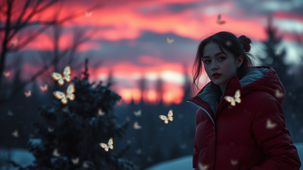 Blurry image of winter puffer jackets in a snowy landscape at night, enveloped by a surreal sky dominated by shifting reds and blues, with luminous butterflies casting a delicate glow in a shadowy forest. The style is minimalist and elegant, with androgynous features and a cold palette featuring hints of dark shades. The scene exudes a cosmopolitan energy with serene expressions and a sense of fluidity and ethereal abstraction, embodying a harmonious chaos.