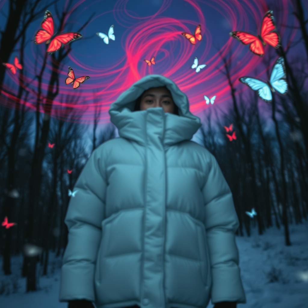 Blurry photograph of a snowy winter puffer jacket in a nighttime setting, under a surreal sky swirling with winds of change in vibrant shades of red and blue. Realistic butterflies glow softly, flitting through a dark forest. The scene embodies minimalist beauty with androgynous figures in light black tones. A cold palette permeates the composition, exuding cosmopolitan energy through serene, ethereal faces. The attire is loose and fluid, surrounded by abstract forms suggesting a sense of tranquil chaos.