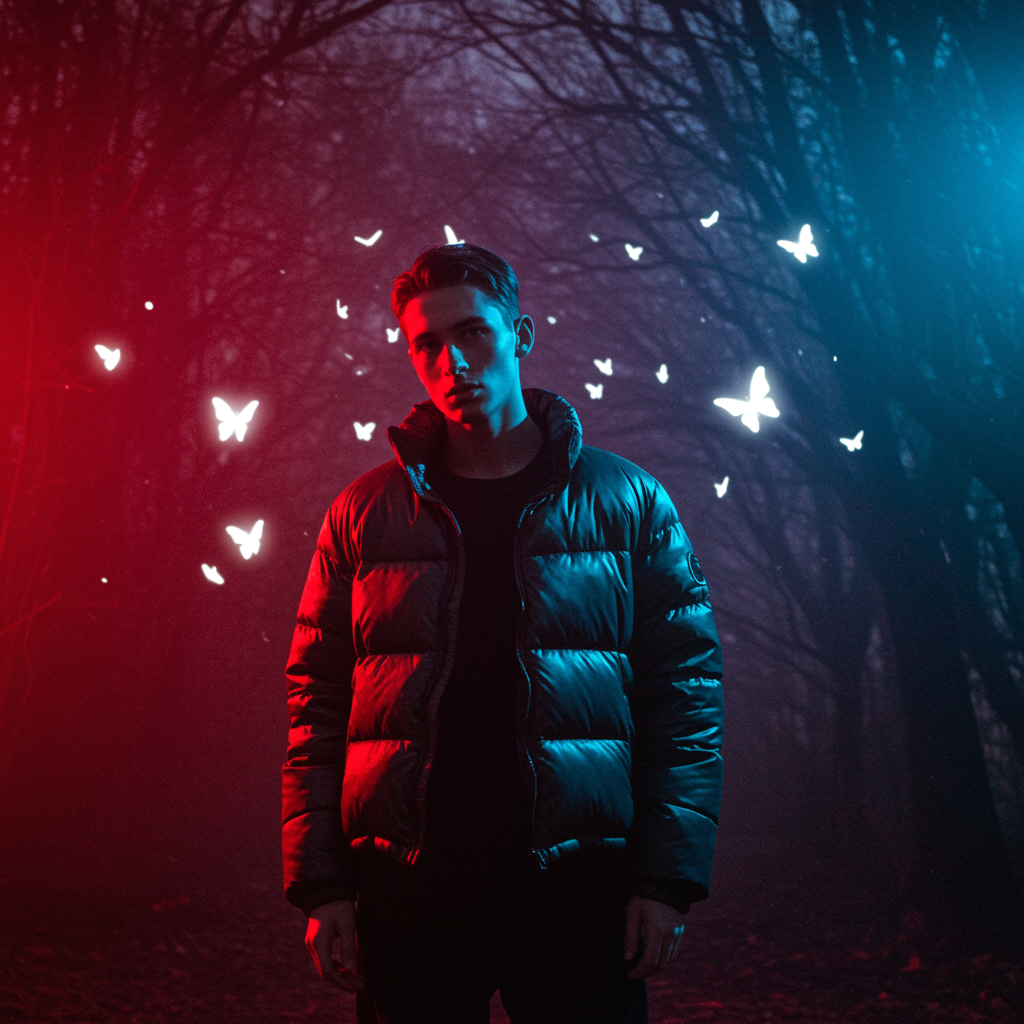 blurry winter puffer jacket fashion scene under a surreal night sky, swirling with winds of change in shades of crimson and azure, luminous butterflies casting soft glows in a shadowy forest, styled in minimalist elegance; gender-neutral, with a cool, muted palette exuding cosmopolitan sophistication, serene expressions, fluid and dreamlike forms, evoking ethereal abstraction and controlled chaos