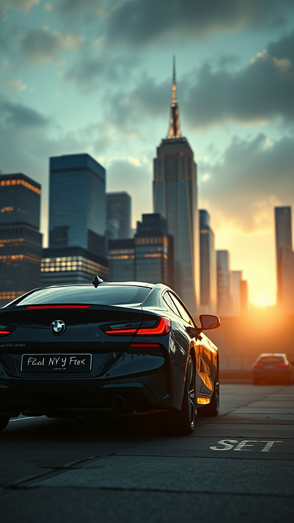 BMW luxury car set against the iconic skyline of New York City, captured in a digital artwork inspired by the styles of Eugene de Blaas and Ross Tran. The scene is infused with dramatic lighting and highly detailed elements, embodying the essence of romanticism with a cinematic quality, reminiscent of works found on ArtStation. The piece reflects influences from Greg Rutkowski, with a focus on absurd resolution, high quality realism, and unforgettable imagery. The setting is intentionally grainy and has an almost dreamy, slightly blurry effect, evoking a sense of fantasy. Despite the meticulously crafted car and cityscape, there's an intentional addition of artistic imperfections—such as poorly depicted anatomy and limbs, random text, signatures, and occasional jpeg artifacts—to introduce an element of playful absurdity and contrast within the luxurious theme.