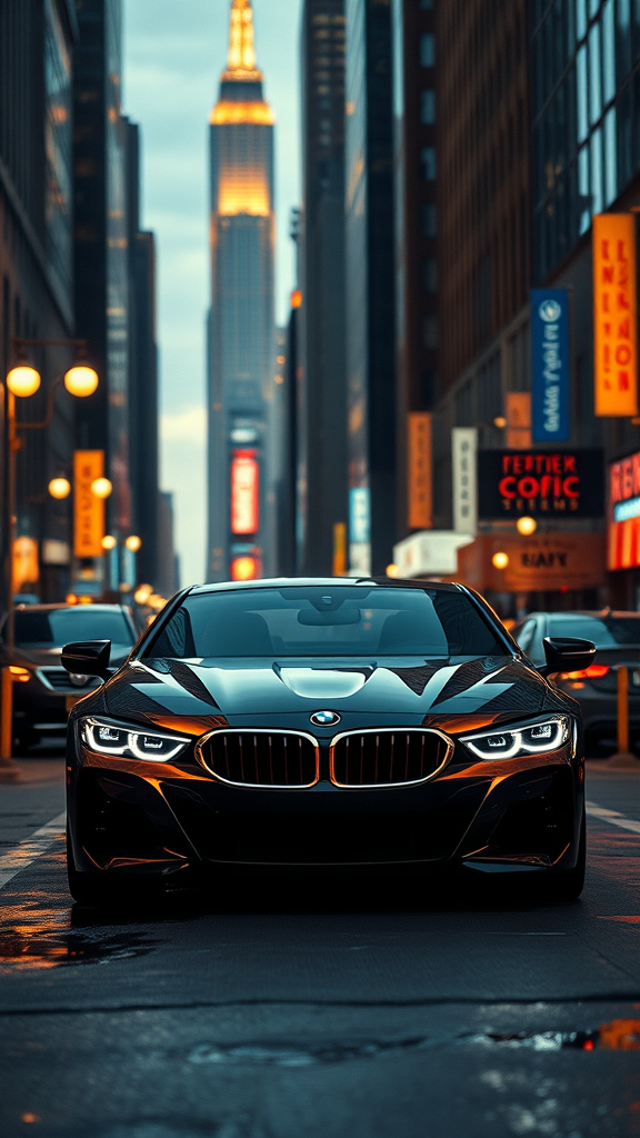 BMW luxury in New York, epic digital art inspired by Eugene de Blaas and Ross Tran, featuring dramatic lighting and intricate detail in the romanticism style, cinematic composition worthy of ArtStation, hints of Greg Rutkowski's influence, rendered in absurd resolution with high quality, unforgettable with a touch of artistic blur, hints of plastic-like smoothness and a subtle grainy texture, with elements of duplication. Features whimsical distortions in anatomy, subtly exaggerated limbs, abstract text and indistinct markings like names or signatures, faint watermarks, embracing an intentionally lower quality with jpeg artifacts for an avant-garde aesthetic.