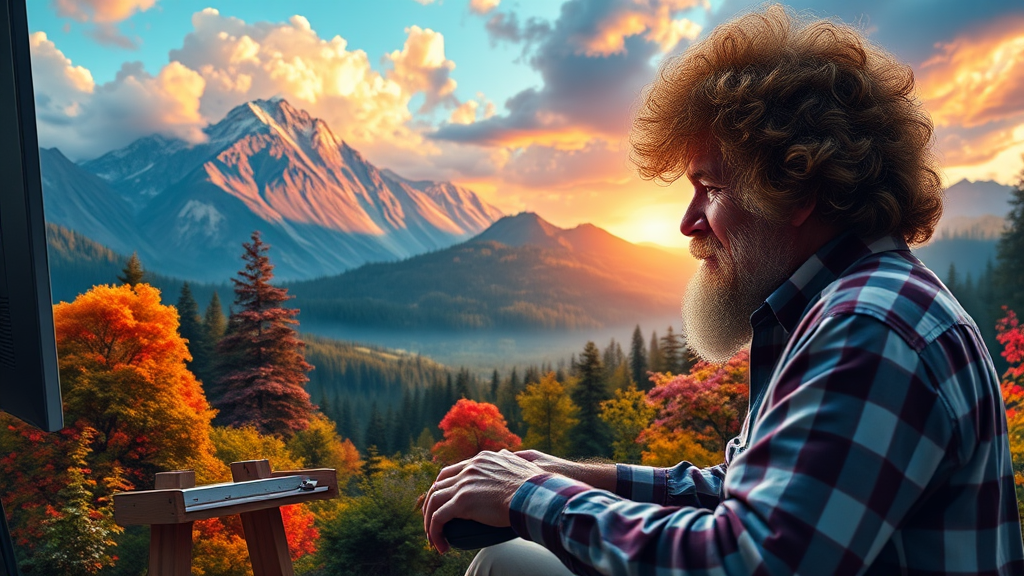 Bob Ross digitally painting a vibrant landscape using a computer mouse, captured with the sharp clarity of a Nikon Z9 and Canon 5D in a stunning natural environment, featuring exquisite 4k detail, rich depth of field, enhanced bloom lighting, and a captivating bokeh effect.