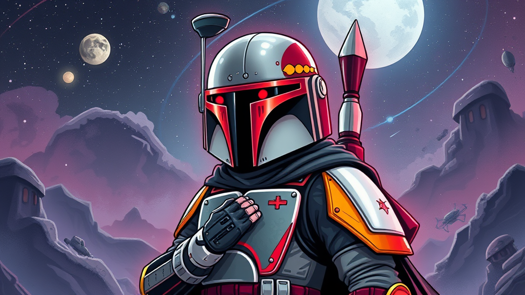 Boba Fett inspired character by artist Chris Phu, portrayed in a graffiti-influenced style with cartoonish humor, featuring elements of silver, ragecore, and caninecore. The scene is infused with celestialpunk ambiance, highlighted by a palette of dark white and red, capturing an imaginative fusion set against a cosmic backdrop, and showcasing subtle creative twists within an aspect ratio of 90:127 with vibrant flair.