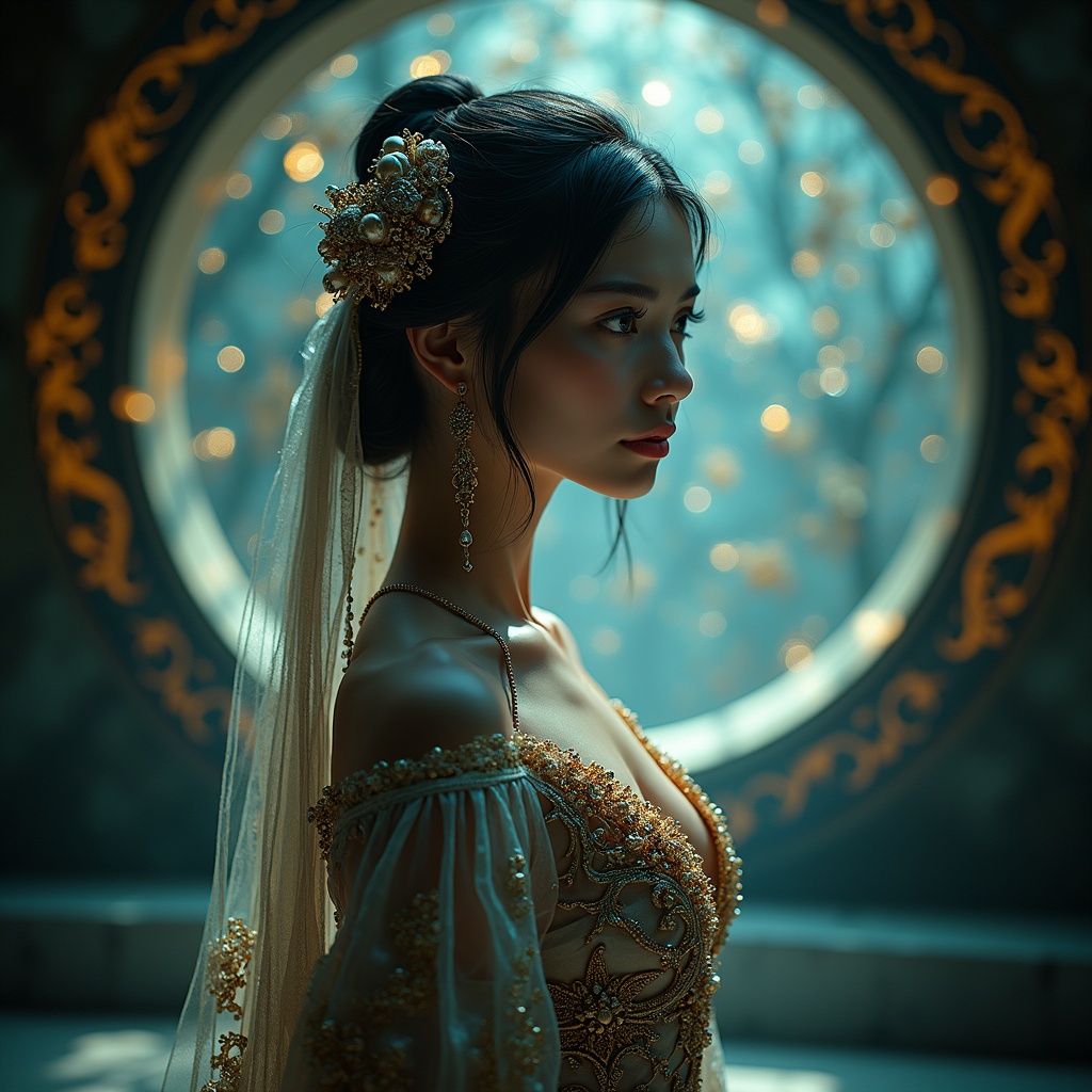 A full body close-up side view of a graceful young woman with a face like a serene princess, slender and ethereal, dressed in intricately detailed magician's attire inspired by Japanese mysticism. Her large, expressive eyes reflect a sense of wonder and innocence. She stands before an intricately detailed magical portal that shimmers with an aura of enchantment, casting reflections of mystical light. The cinematic lighting enhances the ethereal ambiance, highlighting the interplay between shadows and gleams of magic, creating an atmosphere that is both majestic and mysterious.