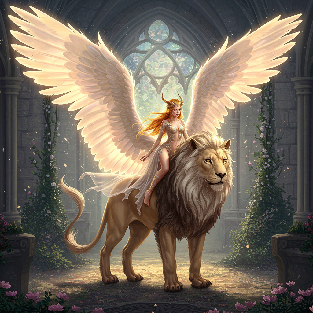 View this AI-generated image featuring a full body photograph of a majestic mythical lion with expansive feathery and glowing transparent wings carrying a serene female rider on its back the scene is imbued with symmetrical hyper detailed textures and adorned with pearl filigree the concept art is r