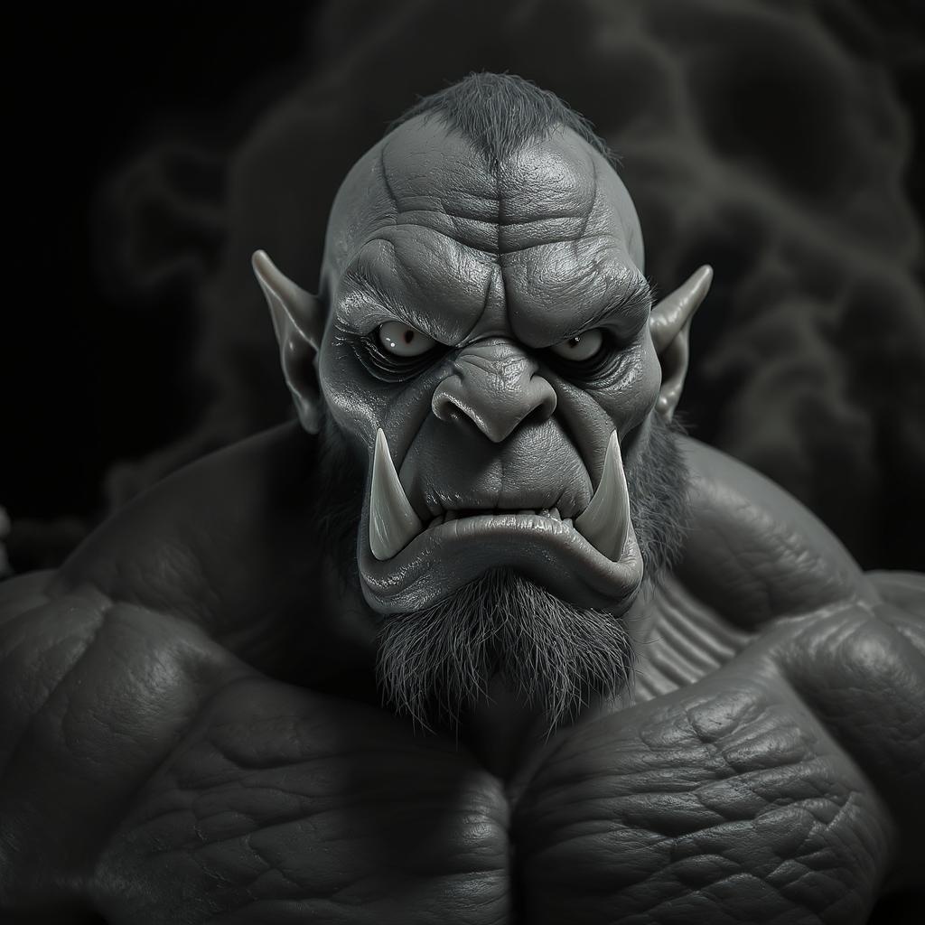 Body portrait of a very angry orc chieftain, exuding an intimidating, menacing, and powerful presence from a low angle. The scene captures a sense of horror with an octane render, focusing on smooth, sharp details. The orc's symmetrical face is rendered with fine details, creating a masterpiece that would trend on Artstation. This 4k HDR 35mm photography piece is inspired by the works of Stanley Lau, Jason Chan, and Mark Hill. The orc is depicted in a 3D render with a sculpted appearance like a detailed doll, intentionally featuring a monochrome palette to enhance the dramatic effect. Some creative distortions are evident, such as unclear eyes and hints of asymmetry, creating a sense of mysterious menace. The orc's anatomy is unconventional, with exaggerated features, lending a surreal and eerie quality to the portrait. Subtle haze and blur elements add to the ambiance, while all unnecessary blemishes are avoided to maintain high quality and resolution.