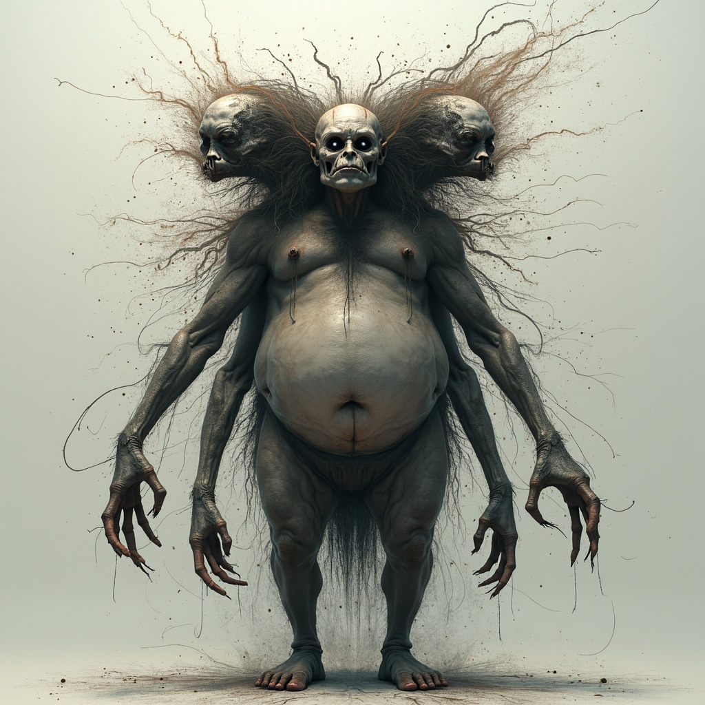 A full body portrait of a grotesque man emerges, embodying surrealism and nightmare fuel, with an unsettling aura. In the style of Greg Rutkowski and Yoji Shinkawa, the digital art piece captures the essence of dark terror, with intricate lines and particles swirling around the figure. The anatomy is deliberately distorted, featuring extra limbs that twist into unnatural poses. His elongated neck stretches impossibly, supporting two grotesquely drawn, misshapen heads that seem on the verge of splitting. The face is a mess of haphazard strokes, mirroring the chaotic rendering of his hands and feet. A corpulent form that hints at disfigurement spills out of the frame, with a bizarre semblance of nightmares brought to life. The artwork toys with the notions of traditional beauty, instead offering a 3D portrayal of bizarre deformity that is both fascinating and disturbing, reminiscent of trending art on platforms like ArtStation.