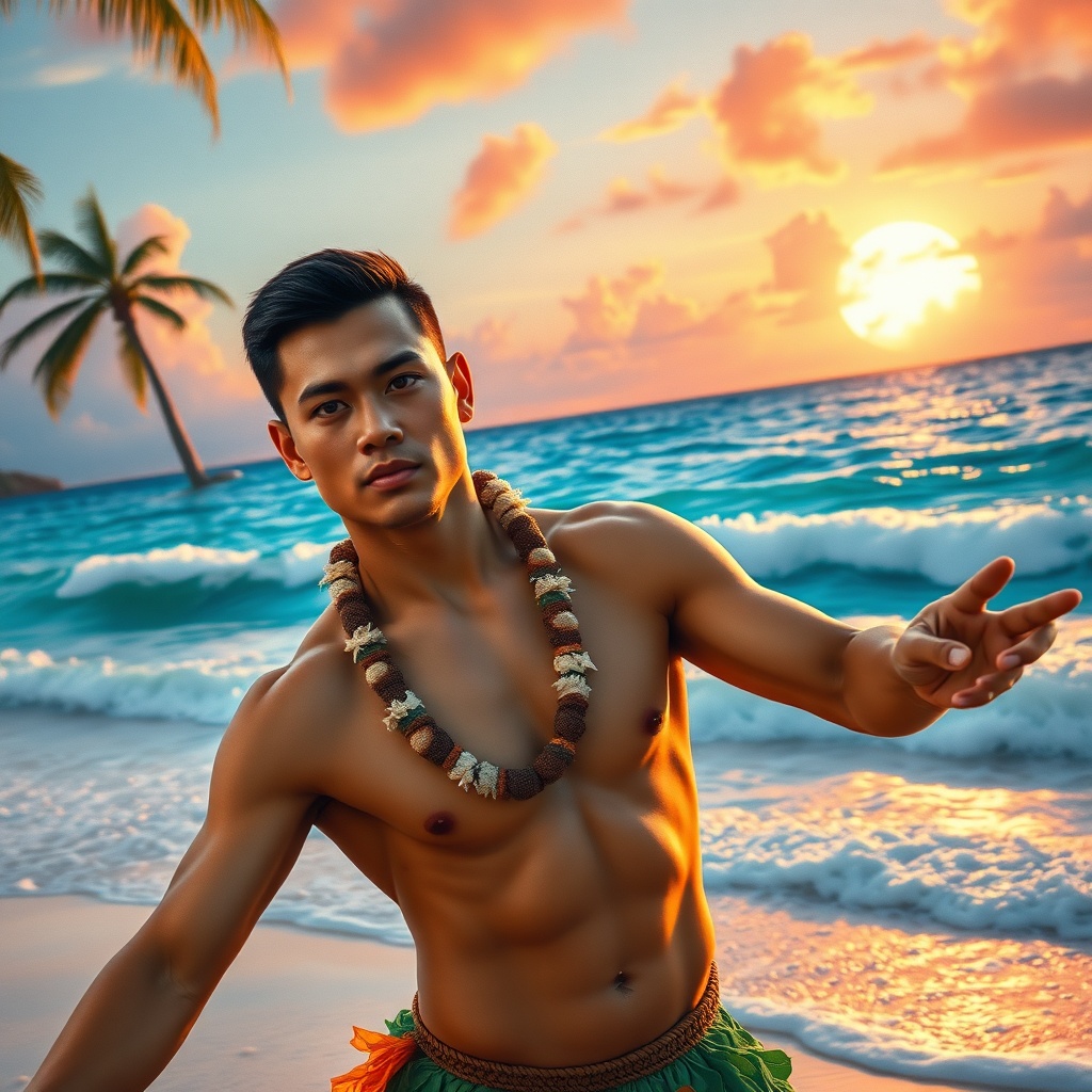 A full body portrait of a strikingly handsome traditional Hawaiian male dancer on a pristine tropical beach, showcasing his youthful vigor and athletic build, with a chiseled physique and captivating eyes, rendered in an ethereal and dreamy photo-realistic oil painting style reminiscent of Studio Ghibli and Robert Wyland. The scene is bathed in dramatic cinematic lighting, captured as if through a 50mm lens, revealing a hyper-realistic and highly detailed portrayal. The dancer's expression is serene yet powerful, embodying the spirit of the islands, surrounded by gentle waves and a vibrant sunset, with palm trees swaying softly in the breeze, infusing the moment with an enchanting aura.