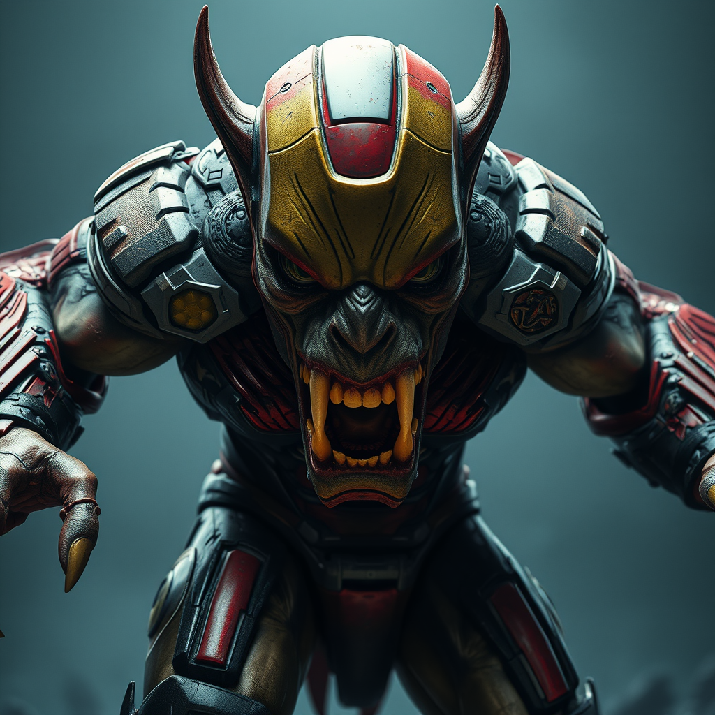 Body portrait of a ferocious orc resembling Iron Man, exuding intense anger and intimidation. The creature stands powerfully in a low-angle view, embodying horror and menace. Rendered in octane, the image is smooth with sharp focus, illuminated dramatically to reveal intricate details. A masterpiece that captures the essence of a high-stakes showdown, it trends on art platforms. Rendered in 4K, inspired by the styles of Stanley Lau, Jason Chan, and Mark Hill, it subtly incorporates creative elements to enhance the original concept.