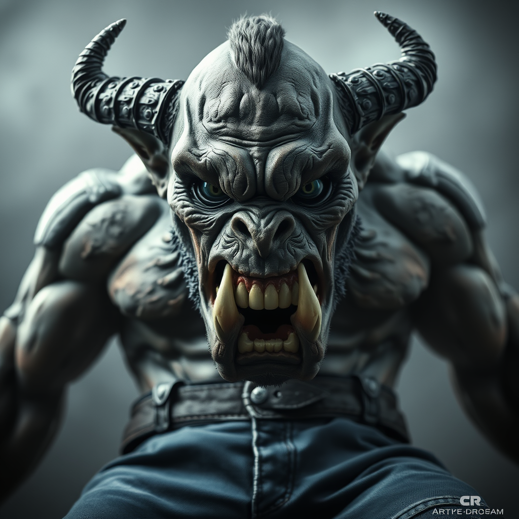 Body portrait of a fiercely enraged orc chieftain, exuding intimidation and authority, rendered from a low angle to accentuate its menacing presence. The scene is captured with horror elements and octane render, bringing out the smooth textures and sharp focus. The orc's face is symmetrical and adorned with fine details, creating a masterpiece that trends on artstation. Shot in 4K HDR with a 35mm lens, the monochrome image offers a nod to the artistic styles of Stanley Lau, Jason Chan, and Mark Hill. The orc is clad in blue jeans, a surreal blend of 3D render and doll-like plastic texture. The photo is enveloped in a blur and haze, introducing an enigmatic atmosphere. Eyes are intentionally blurred to enhance the eerie aesthetic, contrasting with the otherwise perfect anatomy and proportions of the figure. With a seamless merge of sharpness and abstraction, no distracting elements like watermarks or text interfere, ensuring a high-quality, high-resolution portrayal of this powerful figure.