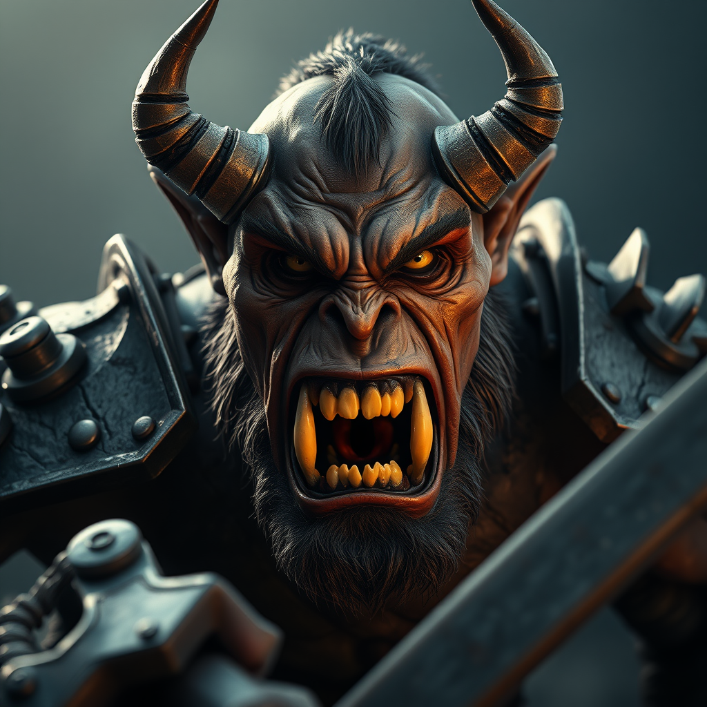 Body portrait of a fiercely enraged orc warrior, clad in iron, exuding an aura of intimidation and raw power. The low-angle perspective amplifies its menacing presence, creating a sense of horror and awe. Rendered in an octane style, the scene boasts smooth textures and sharp focus, with dramatic lighting accentuating the fine details of the orc's sinewy muscles and elaborate armor. This masterpiece captures the essence of power and fury, reminiscent of artworks trending on ArtStation. Crafted in the style of Stanley Lau, Jason Chan, and Mark Hill, the image is presented in stunning 4K resolution.