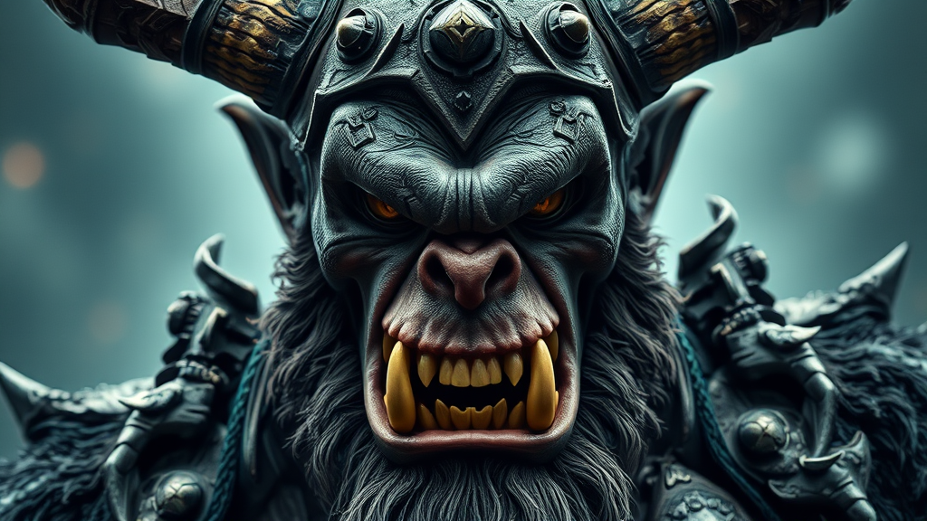Body portrait of a furious orc chieftain; exuding intimidation and power, captured from a low angle for a menacing presence. The image embodies the essence of horror with an octane render, presenting a smooth and sharp focus on a symmetrical face. Fine details shine, resembling a masterpiece as if trending on ArtStation. Rendered in 4K HDR, akin to 35mm photography, with artistic touches inspired by Stanley Lau, Jason Chan, and Mark Hill. The chieftain stands centered, with subtle modifications enhancing the dynamic composition while maintaining the core's imposing essence.