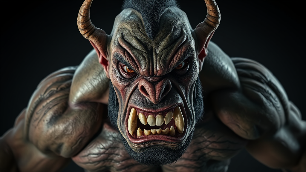 Body portrait of a furious orc exuding intimidation and power, captured from a low angle to enhance its imposing presence. The orc's menacing expression is accentuated by dramatic, high-contrast lighting that casts sharp shadows, highlighting the fine details of its rugged features and muscular build. Rendered with smooth, high-definition focus in a stunning, polished style reminiscent of an octane render. Influences of renowned artists Stanley Lau, Jason Chan, and Mark Hill are evident in the masterpiece's flawless execution and breathtaking detail. Perfectly crafted for trending on ArtStation in 4K resolution, it combines elements of horror and fantasy in a visually striking composition.