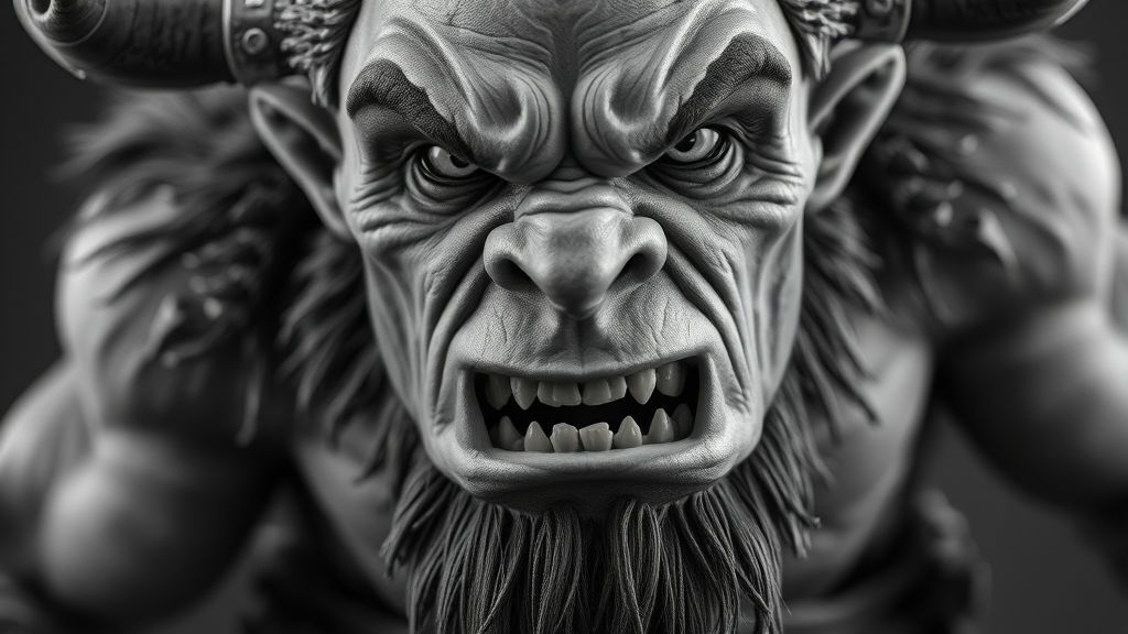 Body portrait of a very angry orc chieftain, exuding intimidation and menace, portrayed with a powerful presence from a low angle. The atmospherics are rich in horror elements with an octane render that is smooth and sharply focused, displaying a symmetrical and detailed face. This masterpiece, reminiscent of works trending on ArtStation and inspired by artists like Stanley Lau, Jason Chan, and Mark Hill, is captured in 4K HDR 35mm photography. The orc dons centered blue jeans, bringing a modern twist, and is rendered in 3D with a doll-like quality. The monochrome black and white palette adds to the eeriness, combined with an intentional blur and haze effect. Despite the highly detailed artistry, there's an uncanny aspect with unclear eyes and an underlying suggestion of imperfect anatomy. The work artfully suggests elements like asymmetric eyes and subtly incorporates abstract notions of extra limbs or deformations, emphasizing the horror theme without explicit details. The overall composition deliberately avoids clutter with no visible arms, fingers, or lower limbs, maintaining focus on the face and upper body. There are no logos, text, or watermarks, ensuring a clean, high-quality resolution without distractions.
