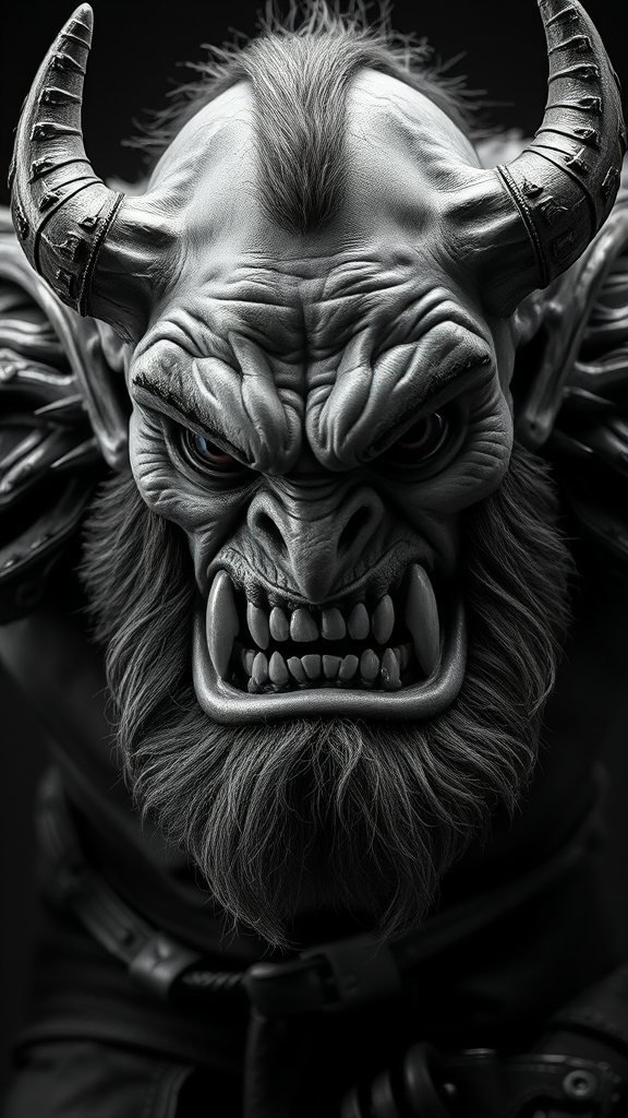 Body portrait of a very angry orc chieftain, intimidating and menacing, exuding power from a low angle with a horror ambiance, rendered in octane with smooth textures, sharp focus on symmetrical face, capturing fine details for a masterpiece quality. This trending art piece on ArtStation is in 4k HDR 35mm photography style, inspired by artists Stanley Lau, Jason Chan, and Mark Hill. It features the chieftain in centered blue jeans with a 3D render look, a mix of doll-like plastic elements, and a hint of blur and haze, presented in monochrome black and white. The imagery avoids elements like unclear eyes, poor anatomy, cropped features, and excessive limbs, while maintaining a high-quality, clear composition without artifacts or distracting elements.