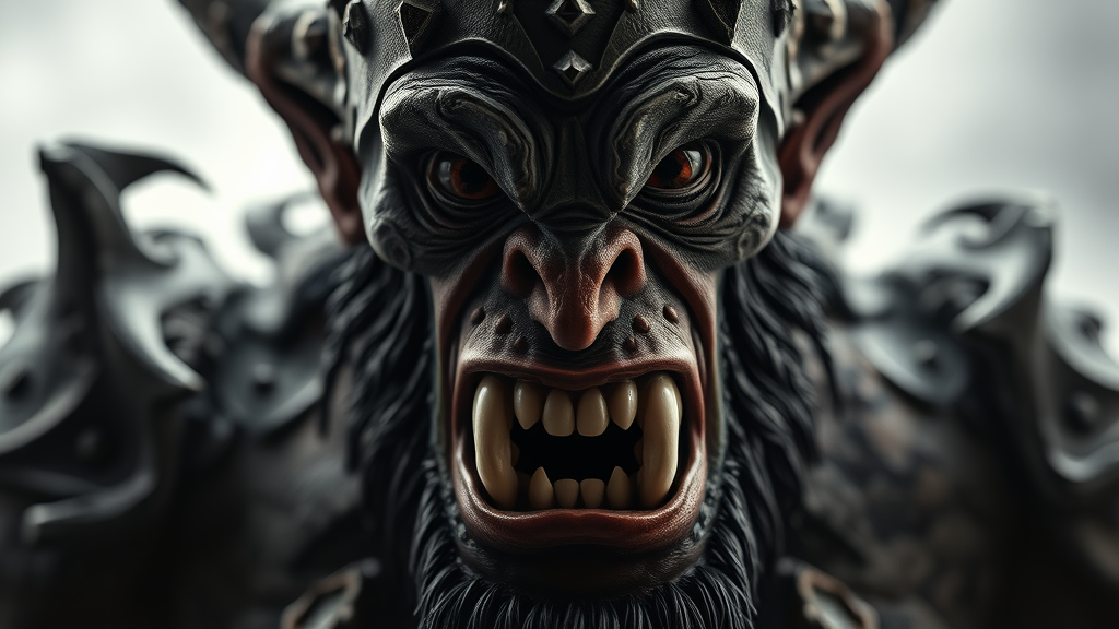 Body portrait of an enraged orc chieftain exuding an intimidating and menacing presence. The perspective is from a low angle, enhancing the chieftain's powerful stature, while evoking a sense of horror. Rendered in octane for a smooth, sharp focus on a symmetrical face, showcasing fine details that make it a true masterpiece. This piece is inspired by art that trends on ArtStation and is crafted in 4K HDR with the clarity of 35mm photography. The piece draws inspiration from artists like Stanley Lau, Jason Chan, and Mark Hill, combining elements of 3D rendering with doll-like features using plastic textures. The atmosphere is monochrome, with a subtle blur and haze effect to add depth. The orc's attire includes centered blue jeans, and although the artwork leans towards realism, slight creative deviations introduce artistic abstraction. The image intentionally incorporates unclear eyes and a slightly deformed anatomy to maintain a sense of otherworldliness. It captures an otherworldly quality, bereft of typical human characteristics, avoiding extra limbs or unnatural protrusions to preserve a coherent artistic integrity. Despite its haunting evocativeness, the piece maintains high quality and resolution, steering clear of artifacts or distortions.