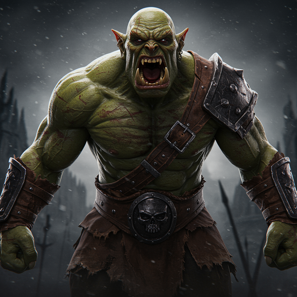 Body portrait of a fearsome orc exuding intense anger, towering and formidable, capturing an intimidating and menacing presence. Rendered from a low angle, the scene is infused with horror elements and enhanced by a high-octane finish. The composition boasts a blend of smooth and sharp focus, enriched by dramatic lighting that accentuates fine details, crafting a true masterpiece. This awe-inspiring image, echoing the artistic styles of Stanley Lau, Jason Chan, and Mark Hill, trends prominently on ArtStation, presented in stunning 4K resolution.